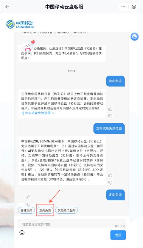 3、在使用中国移动云盘(和彩云)相关上传下载查看等功能服务的过程中,产生的流量使用的是定向流量。定向免流目前只限于已开通中国移动云盘(和彩云)会员的的移动用户,非会员或其他运营商号码暂不支持定向免流的哦!