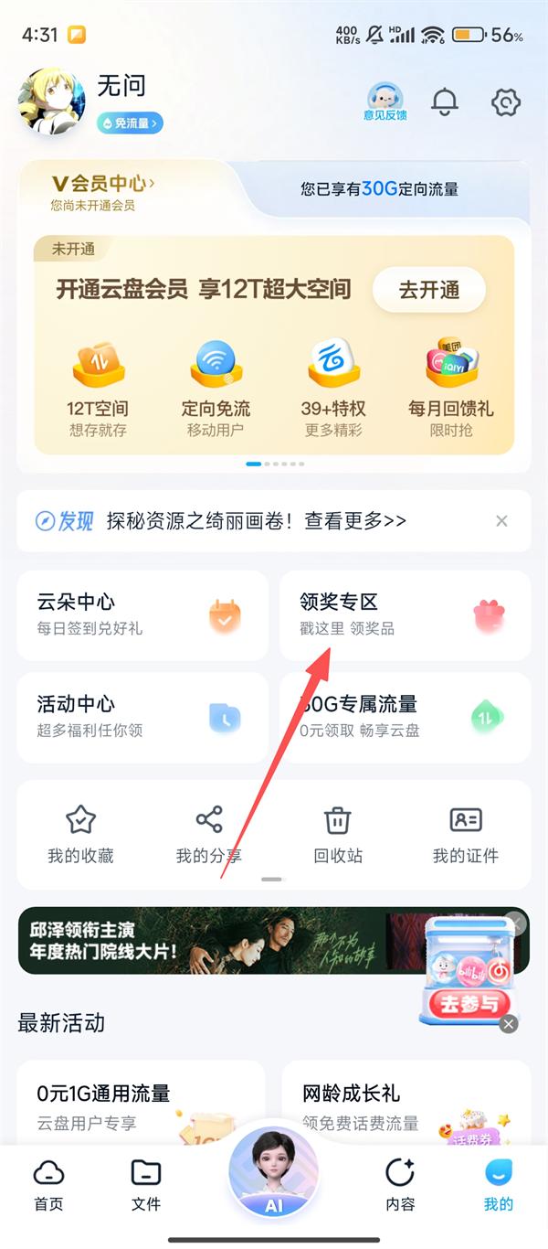 2、在【我的】页面找到【领奖专区】,点击进入,众多流量福利在此等候呢。