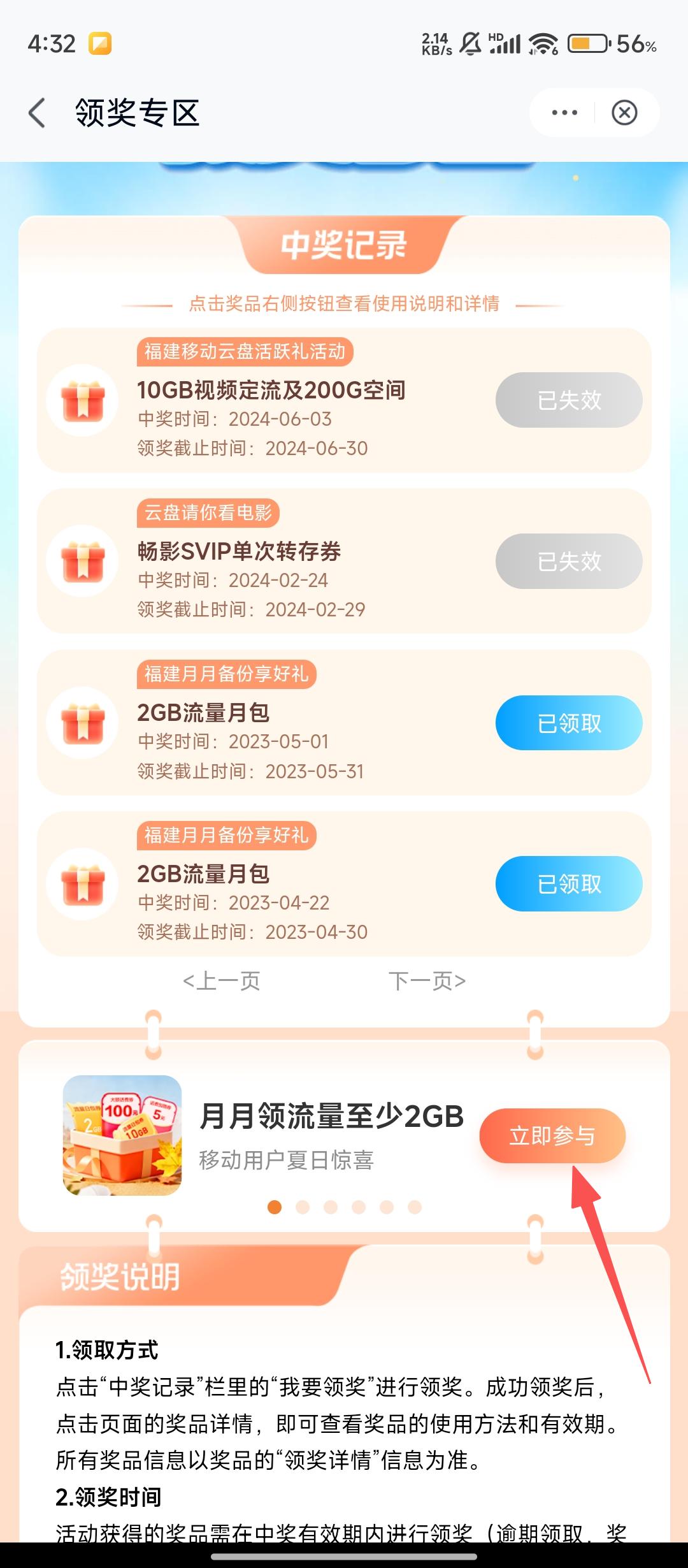 3、进入领奖专区后,找到如【月月领流量至少2GB】的活动,点击【立即参与】,即可参与流量包领取活动啦。