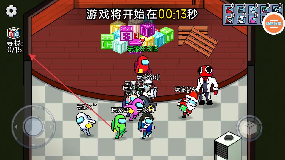 2、进入游戏准备场景,众多玩家角色聚集,上方显示游戏开始倒计时,左侧提示需寻找积木数量,由此开始准备收集积木。