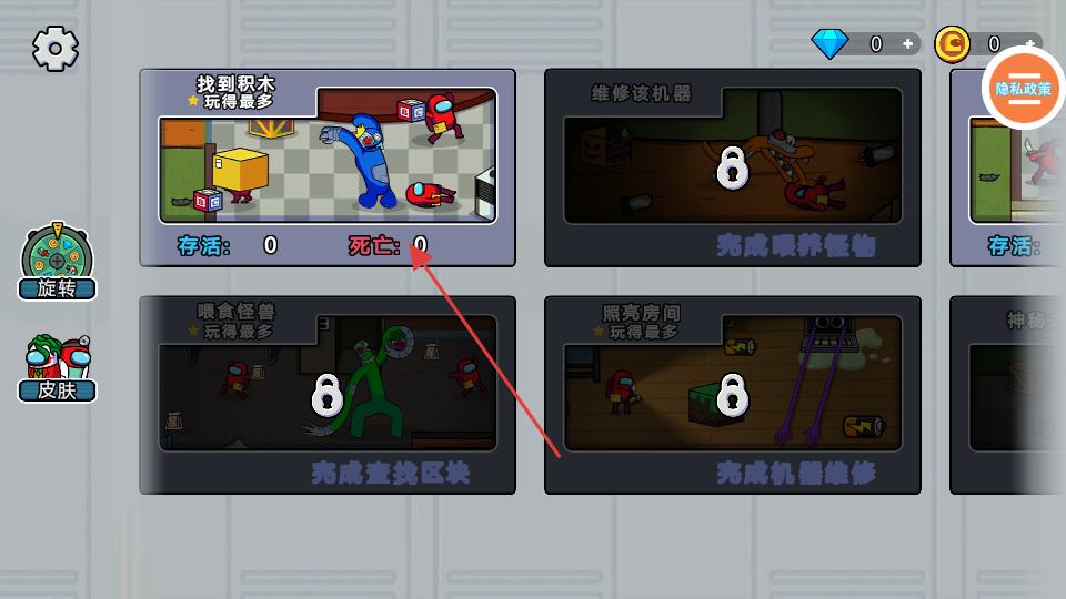1、打开彩虹朋友求生冒险游戏,选择找到积木玩得最多关卡,点击进去就可以开始趣味的冒险了。