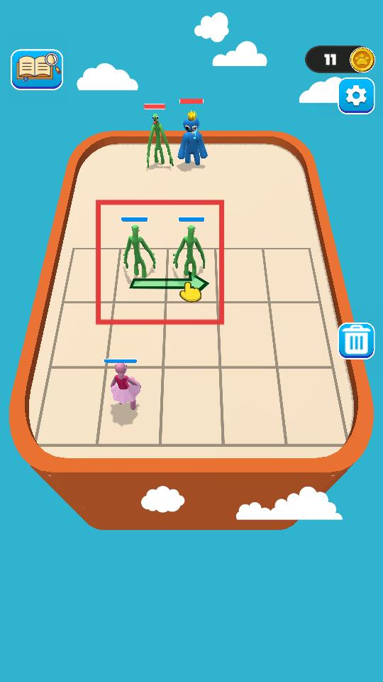 1、棋盘上有不同角色,根据角色特性搭配合理布阵,合成可以让角色升级,想合并出更厉害角色,按照绿色箭头指引,把它们拖到同一格就能触发合成。
