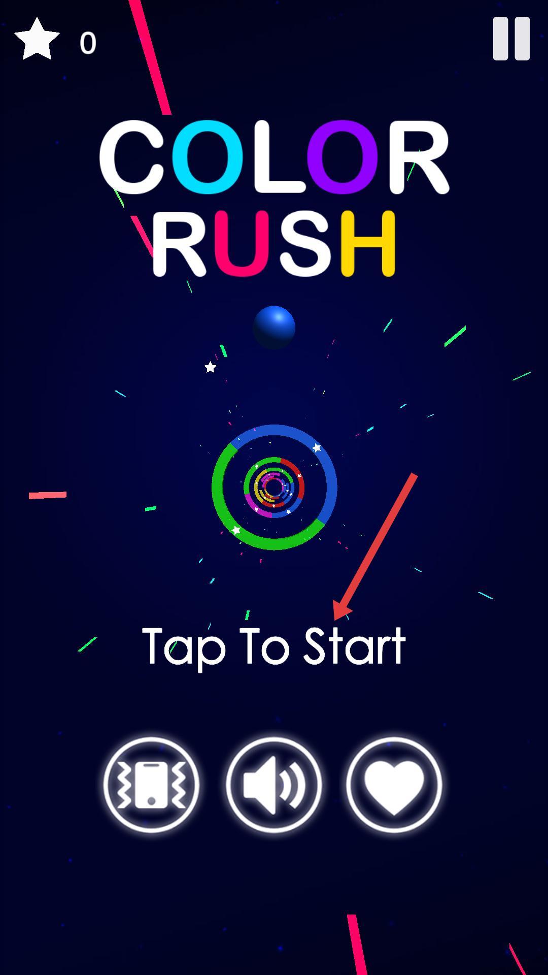 1、游戏主界面有点击开始提示,还有振动、声音、爱心按钮,点击屏幕可开始游戏,进入彩色球穿梭的游戏场景。