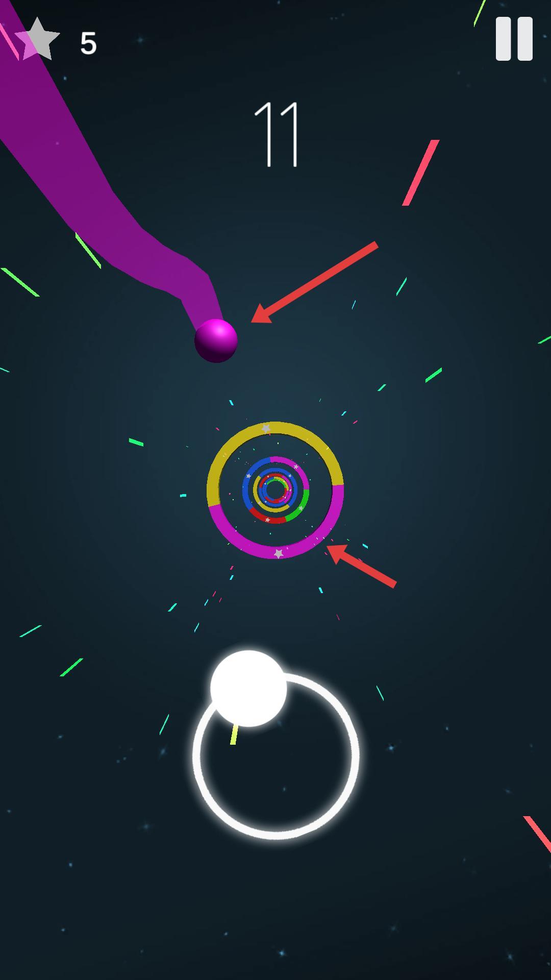 2、彩色球会下落,要操控白色球,让彩色球穿过同色的圆环区域,同时避开其他颜色的圆环,保证小球顺利通过。