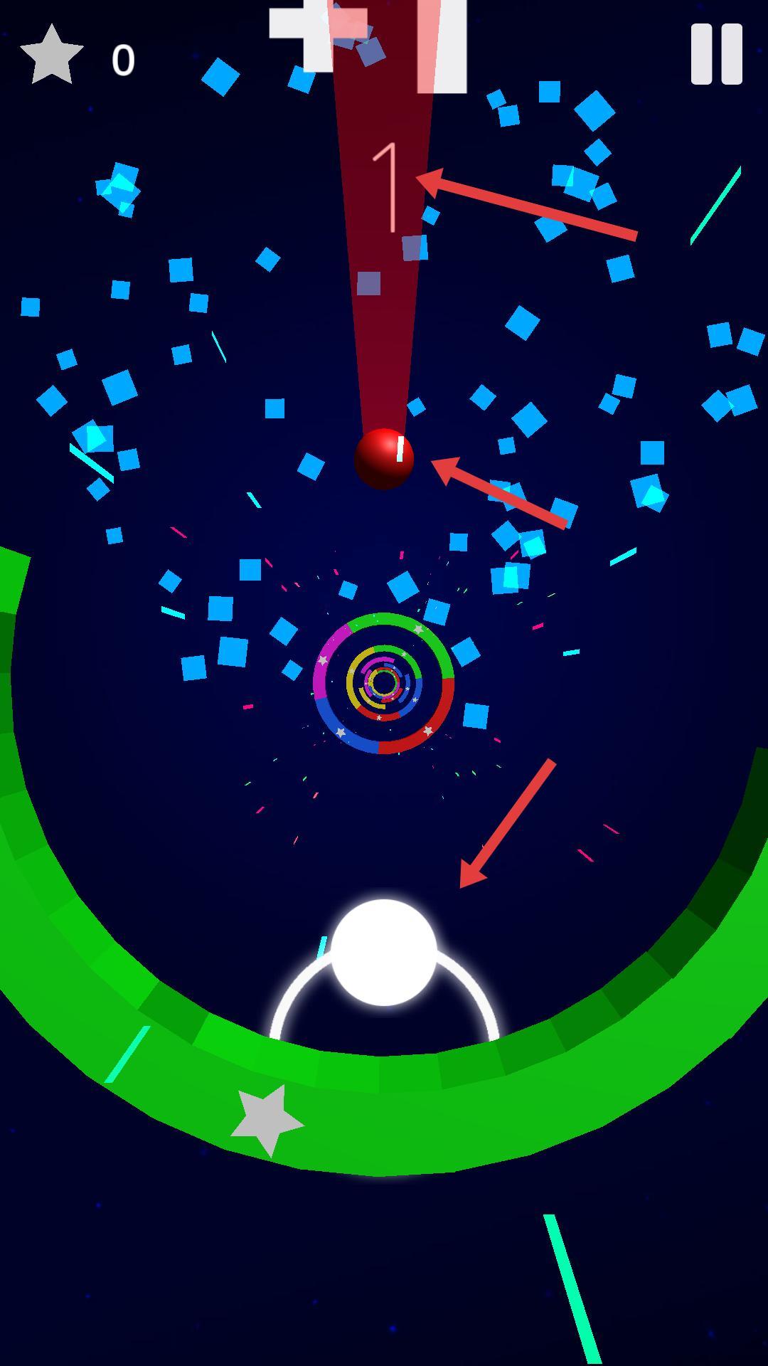 1、基础旋转操作:通过单指滑动控制小球顺时针或逆时针旋转,寻找障碍环缺口并保持色彩同步,完成突破进入下一层空间。