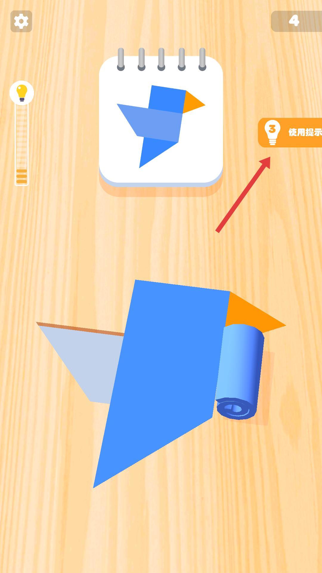 3、拼接蓝色小鸟时,若遇困难点击使用提示,按指引折叠蓝色、橙色纸张,还原图纸小鸟造型。