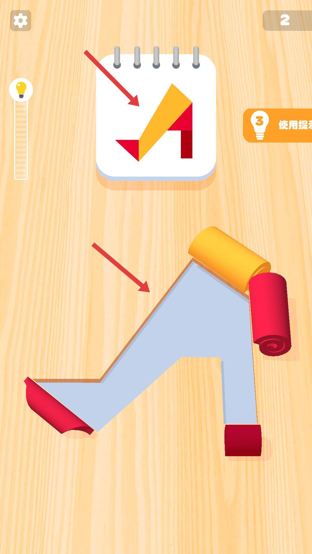 2、参照房屋图纸,先拼紫色主体,利用左侧进度条提示,调整纸张摆放,再拼接紫色屋顶与烟囱。