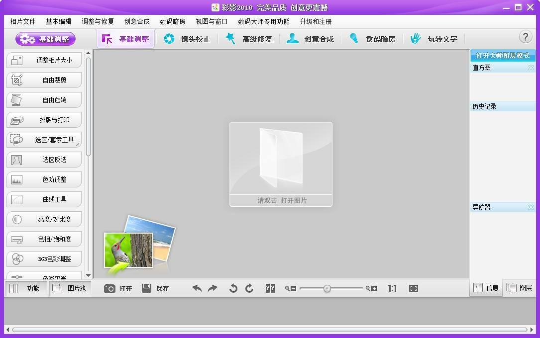彩影是国内功能最强大、使用最人性化的全新一代高画质、高速度数字图像处理软件,您无需专业的图像处理技能即可制作出绚丽的一级专业数码照片效果,让您轻松体验数码图像处理的无限魅力!