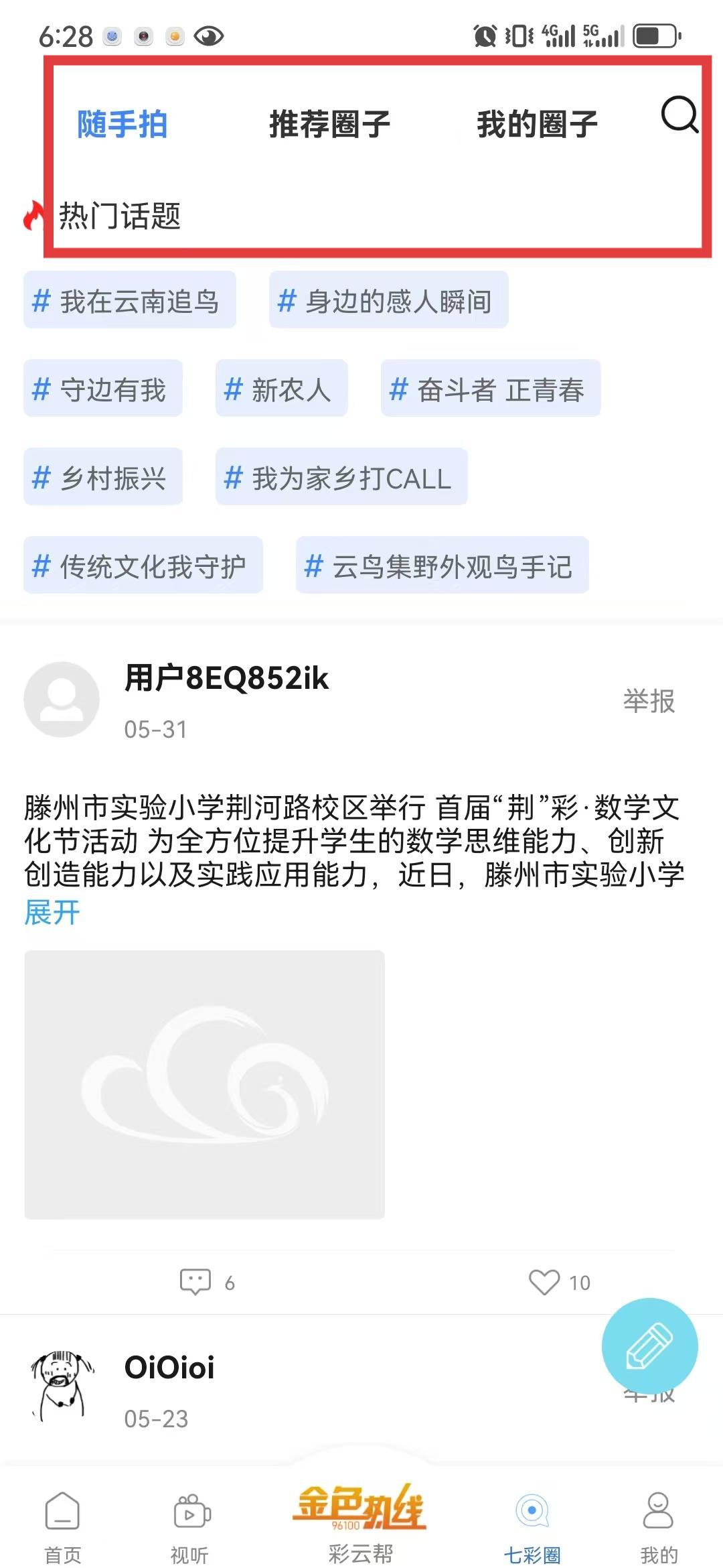 3、七彩圈页面顶部有随手拍、推荐圈子、我的圈子选项,想分享云南的美景就点随手拍,想找有趣的社群选推荐圈子,我的圈子则能管理自己创建或加入的圈子。