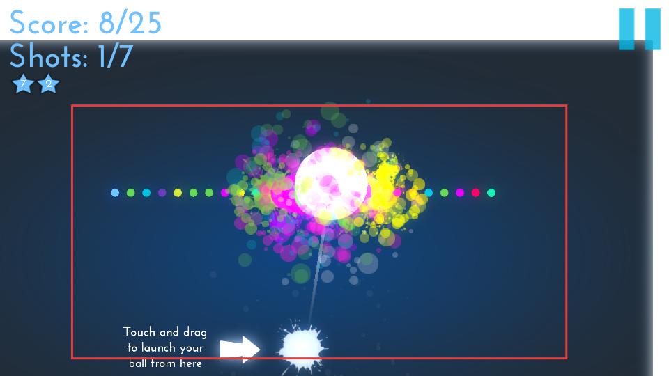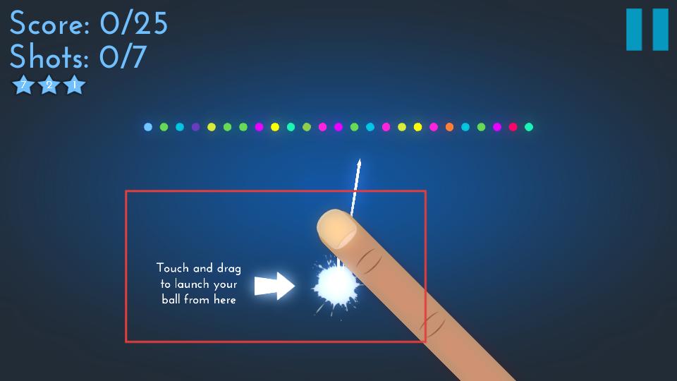 2、游戏中按照提示触摸并拖动,从指定位置发射小球,瞄准上方彩色小球,尽量让发射的小球击中它们,获取分数。