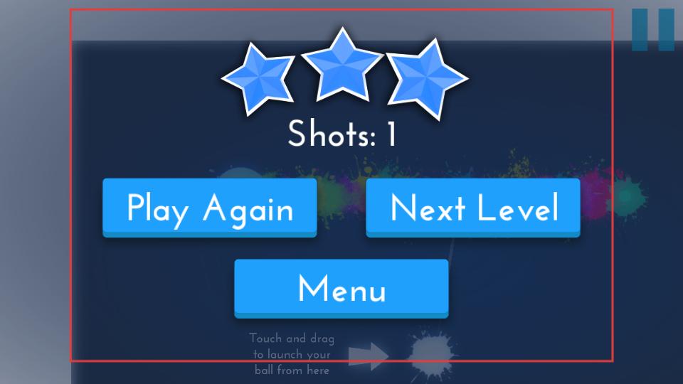 4、成功完成关卡后,会显示结算界面,能看到获得的星星数量和射击次数,可选择Play Again重新玩,或Next Level进入下一关,也能回Menu界面。