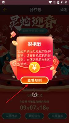 3、如果出现很抱歉的提示,表示还没有抢红包的资格,可以点击规则来看看;