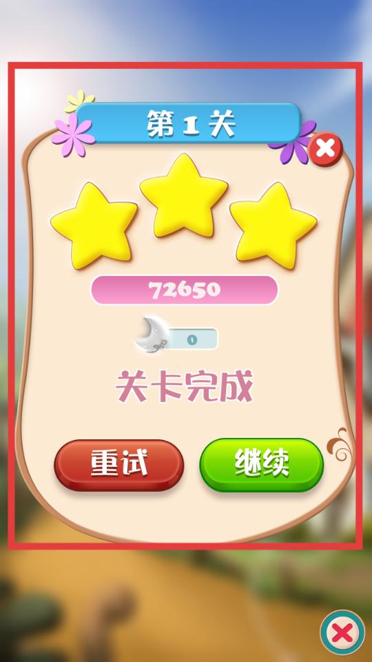 4、关卡完成后,可选择重试重新挑战,或点击继续进入下一关,继续体验消除的乐趣,争取获得更高分数。