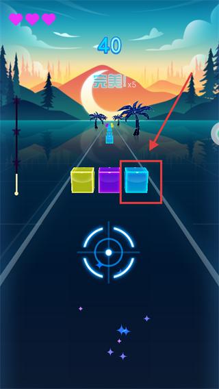 2、当【蓝色】-【方块】音键到位,精准射击得分,连续【完美!x5】击中可获更高分数。