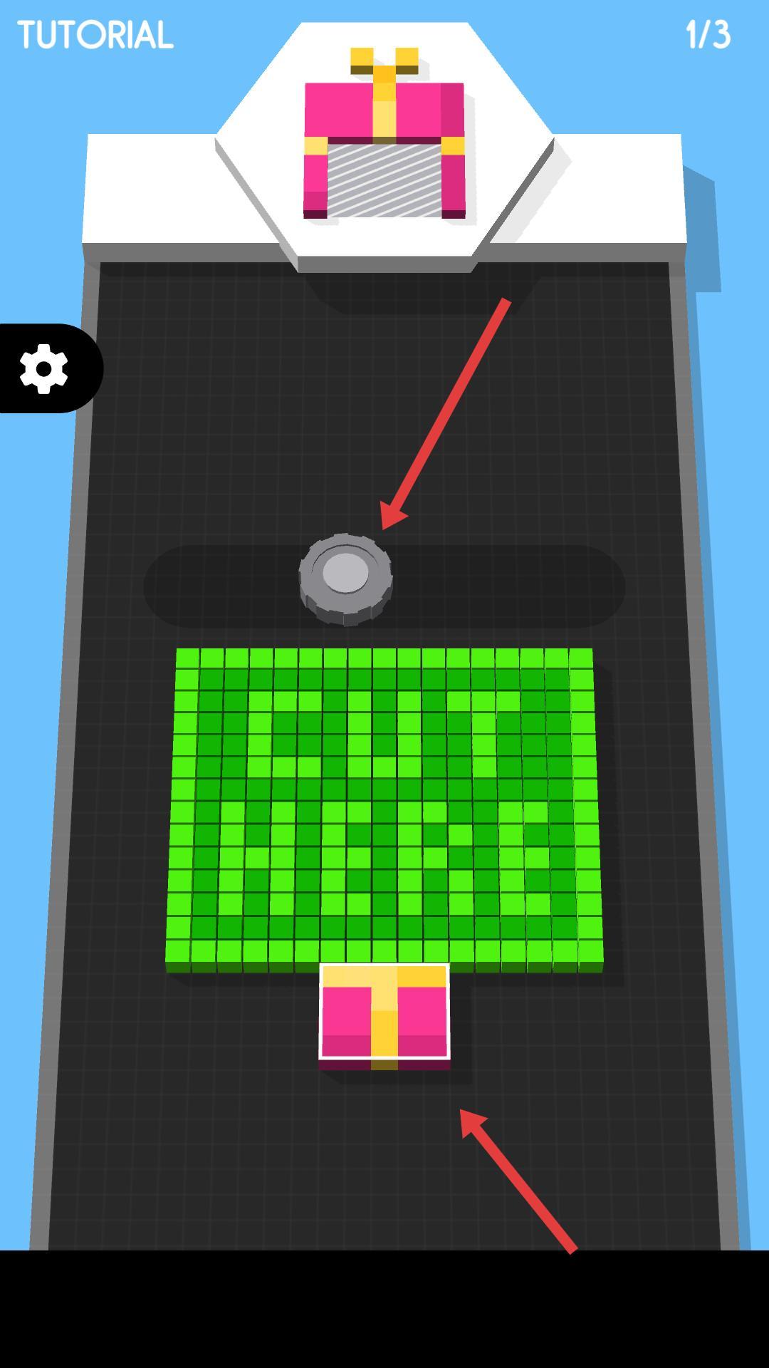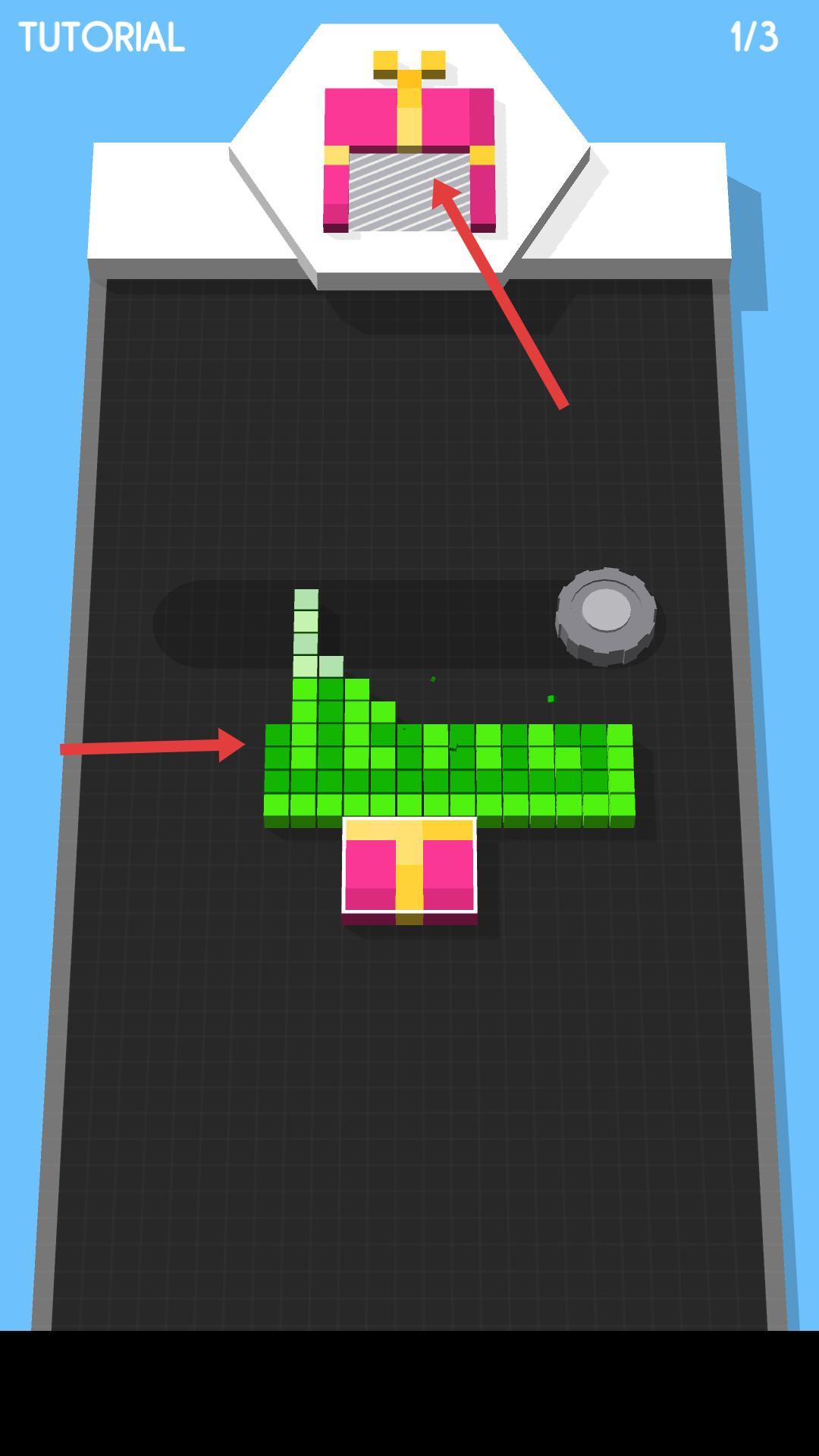 1、教程关卡中,观察绿色方块与粉色礼盒的位置,拖动灰色圆盘,调整绿色方块的形态,使其朝着匹配上方礼盒的方向变化。