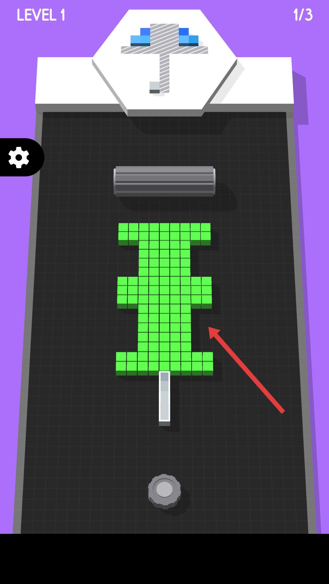 4、第一关里,观察绿色方块的初始形状和上方目标图案,拖动相关部件,调整绿色方块形态,使其与目标图案匹配。