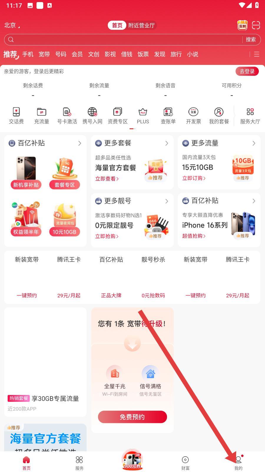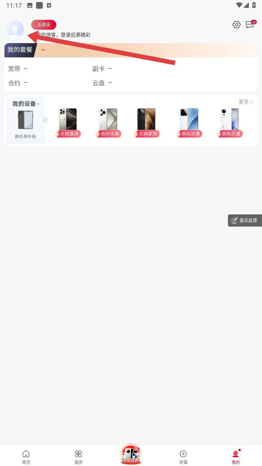 3、进入中国联通APP,同意政策,点我的去登录,通过手机号验证码登录,之后可在首页选服务,如交话费,查账单,管理通信业务。