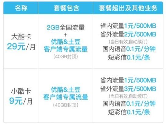 从官方介绍来看,大酷卡每月29元,包含2GB全国流量,以及优酷土豆客户端专属流量(40GB封顶);小酷卡每月9元,同样有优酷土豆客户端专属流量(40GB封顶),但没有赠送额外流量。