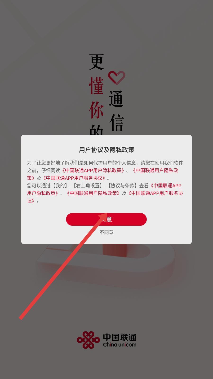 1、打开中国联通APP,点同意协议及隐私,进入后选我的,点击登录,用手机号验证码登录,可查话费流量,办理业务。