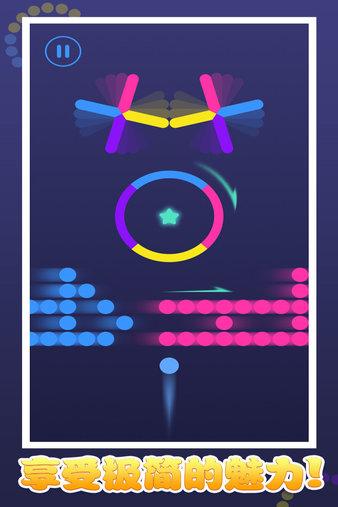 简单的玩法层层递进,玩家需要点击小球,使小球能够撞到屏幕正中间不断旋转的彩色圆环,小球的颜色与撞击区域颜色相同的话就会消除该区域