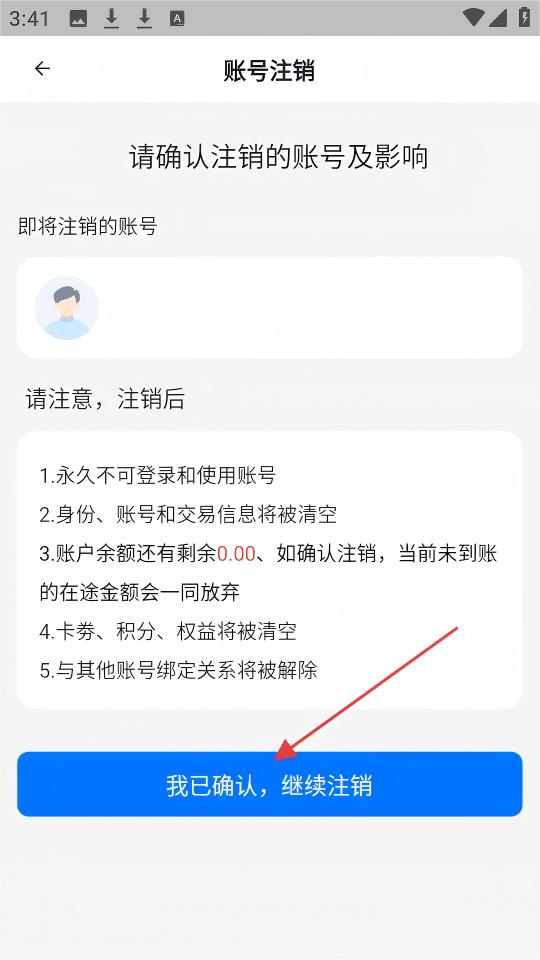4、进入【账号注销】页面后,确认注销影响,点击【我已确认,继续注销】即可继续注销流程。