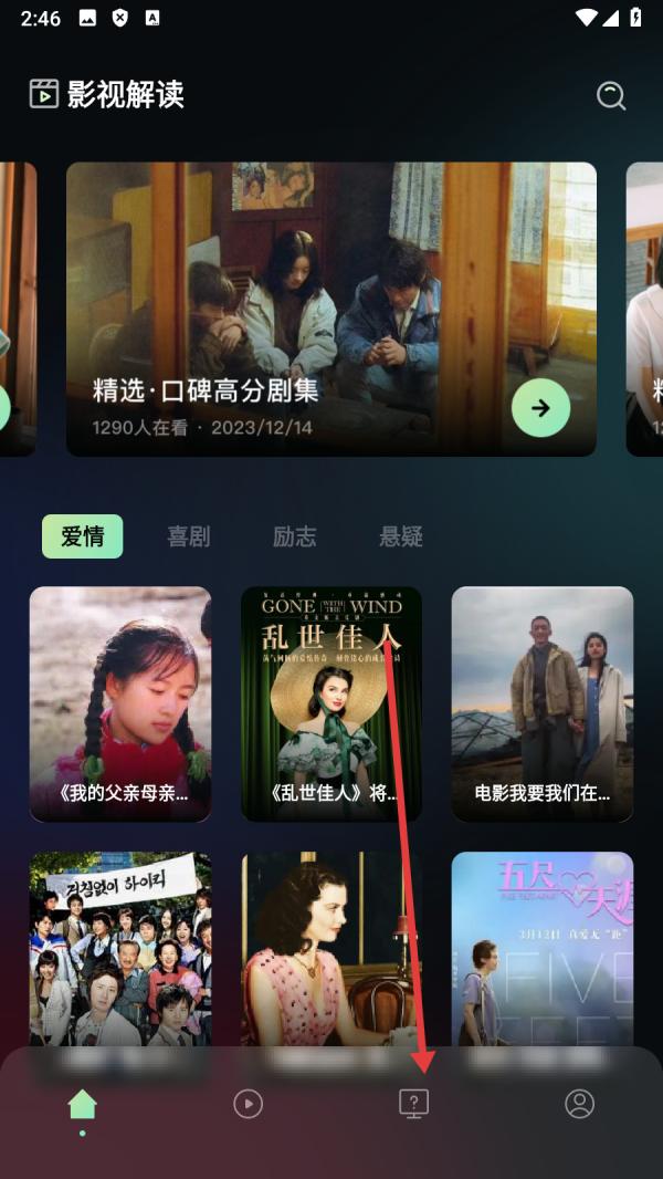 1、在影视解读页面,点击【底部带问号的图标】,进入看图猜剧页面。