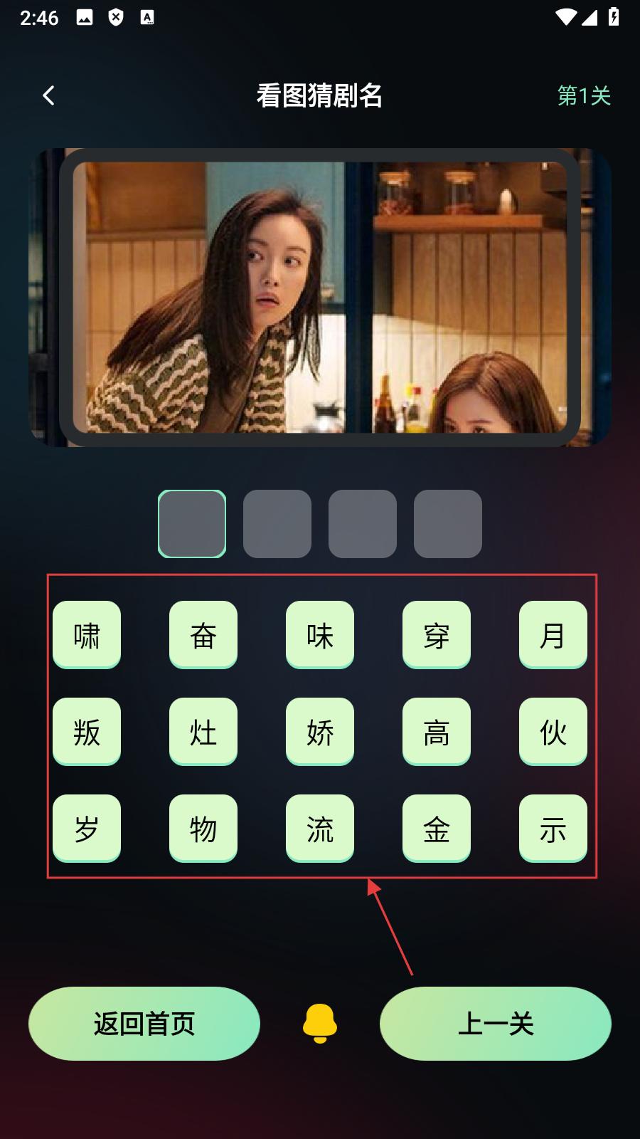4、在看图猜剧名第1关页面,根据【图片从下方文字中选择字】,拼出正确的剧名即可。