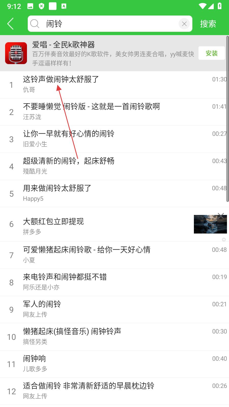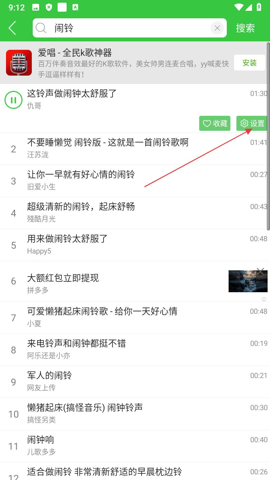 4、点击目标铃声右侧【设置】,将该铃声设置为闹铃,即可完成搜索操作。