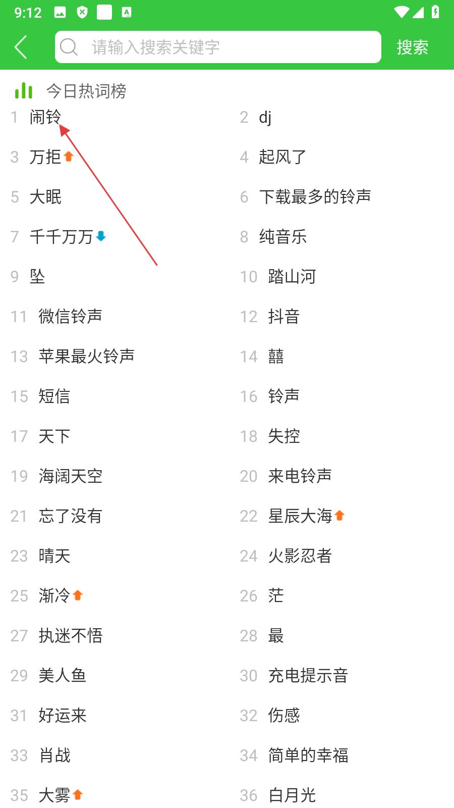 2、选择【喜欢的关键词】进行搜索,进入闹铃相关铃声列表。