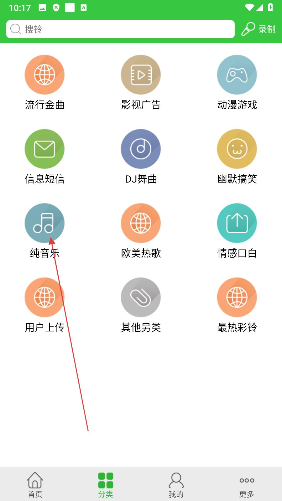 2、在分类页面,点击【纯音乐】,进入纯音乐铃声列表页面。