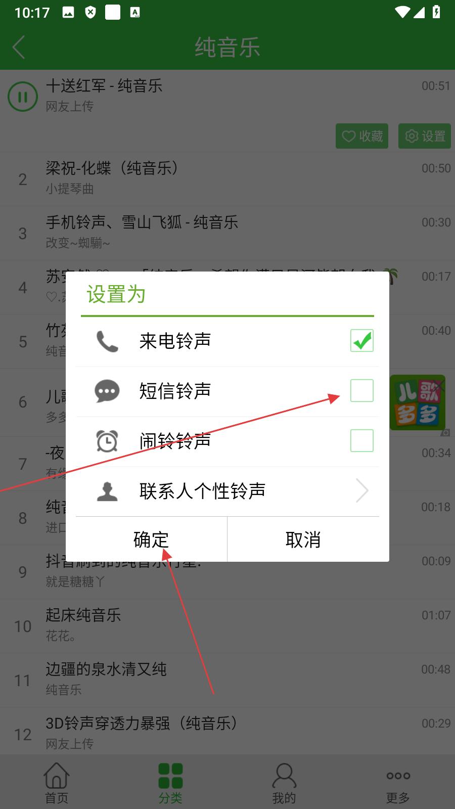 3、在纯音乐铃声列表页面,点击目标铃声右侧【设置】,弹出设置选项框。