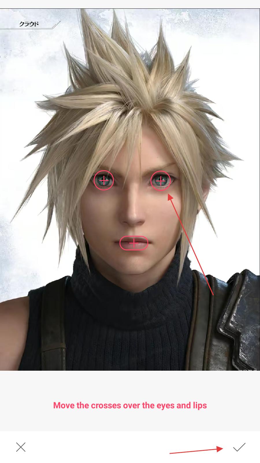 3、在图片编辑页面【移动十字标记到眼睛和嘴唇位置】后,点击【确认】。