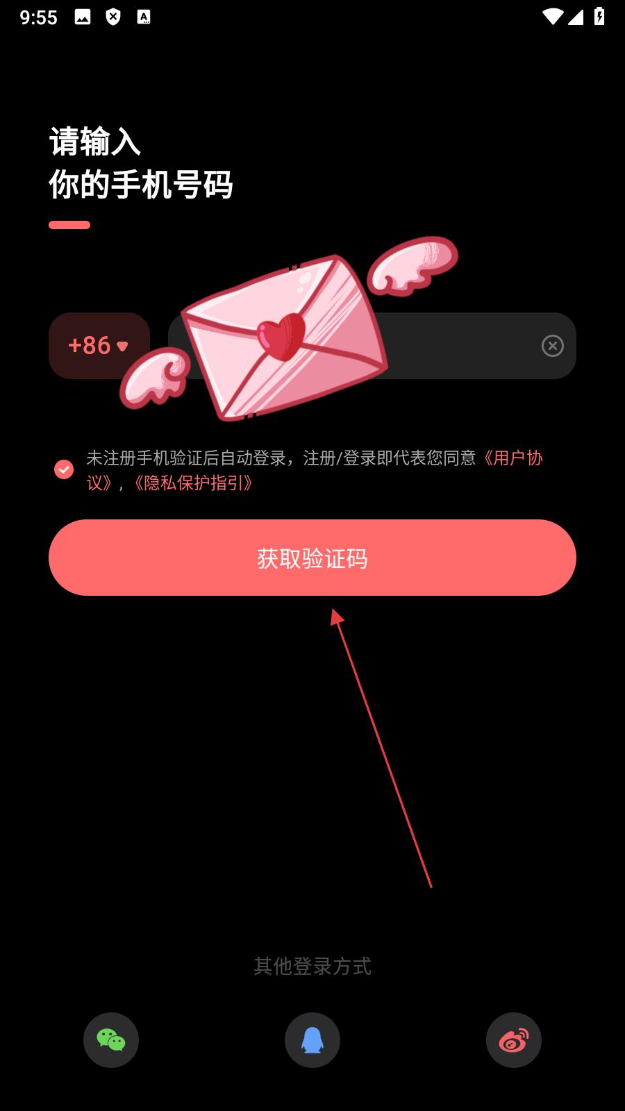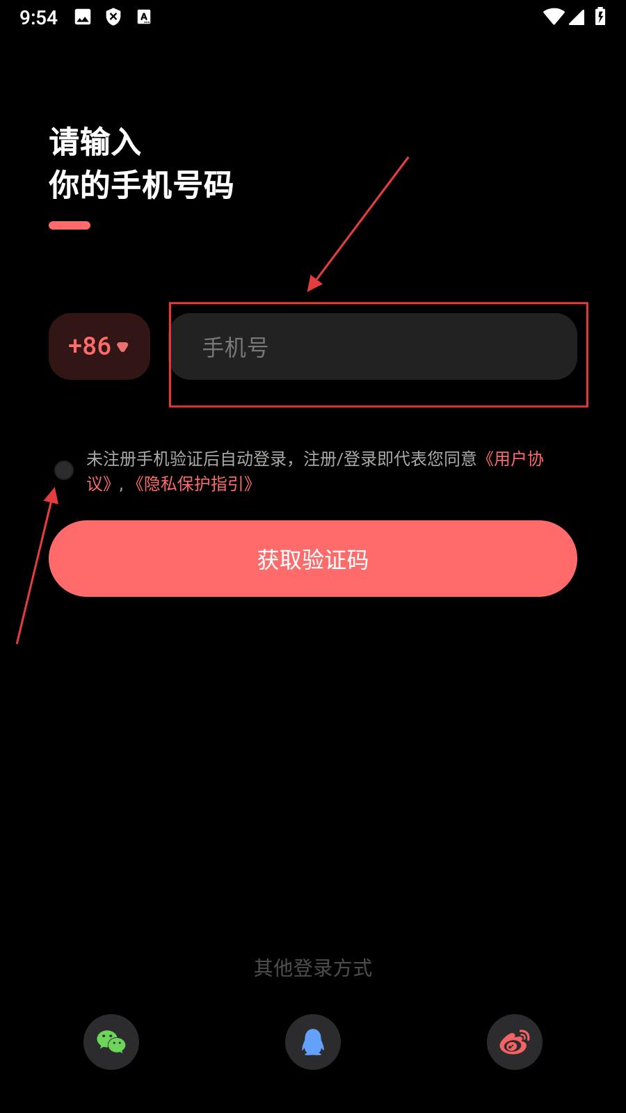 2、在手机号输入页面,输入【手机号并勾选协议】,准备获取验证码。