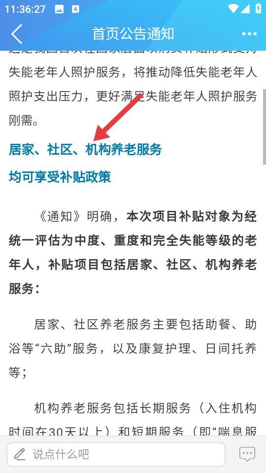 2、首页公告通知页深度解读失能老人补贴政策,明确中度、重度和完全失能老人为补贴对象,居家、社区、机构养老服务均涵盖,助餐、助浴等服务内容清晰罗列。