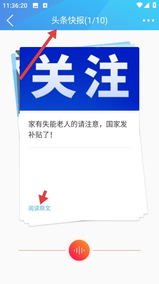 1、头条快报界面以卡片形式推送民生资讯,如家有失能老人可领补贴的消息,搭配阅读原文入口与音频播放按钮,方便用户快速知晓政策要点。