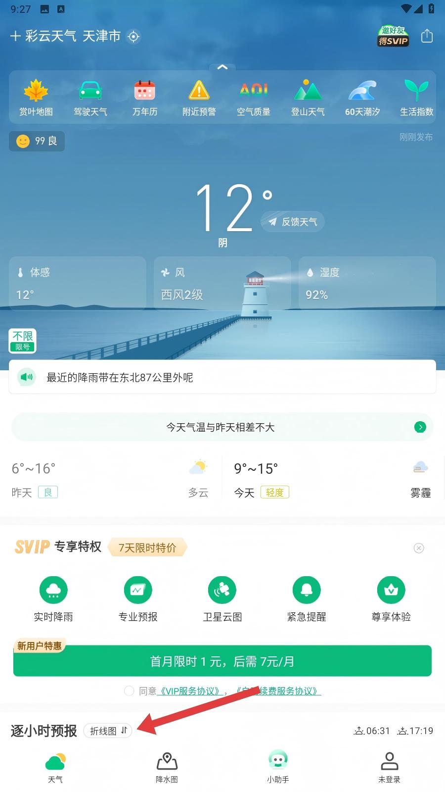 1、进入彩云天气主界面后,点击【逐小时预报-折线图】,即可查看更细致的时段天气哦。