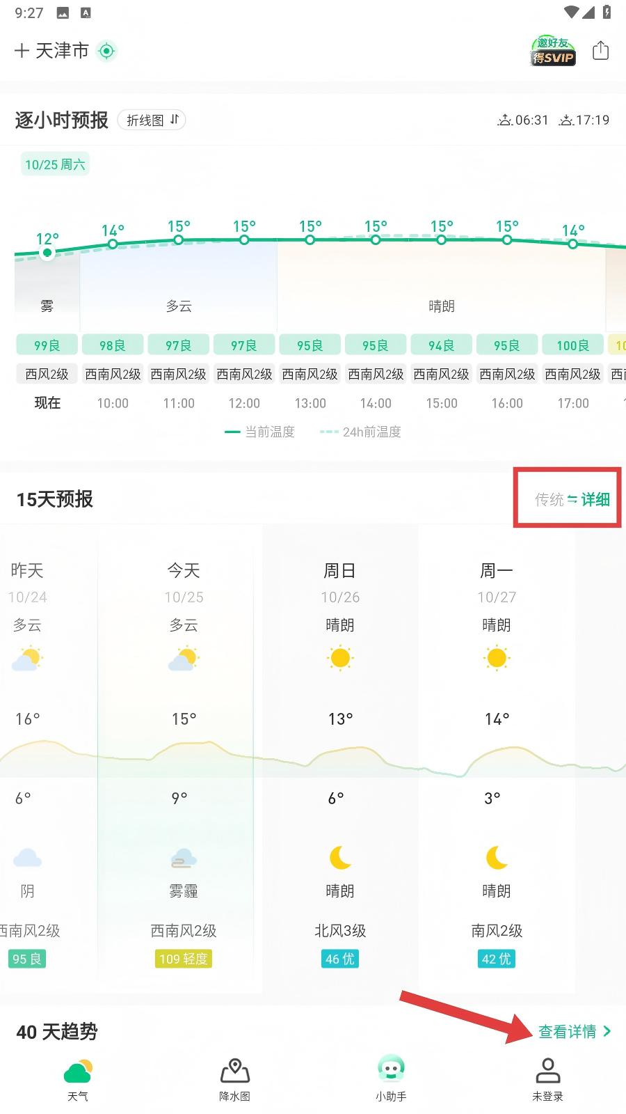 2、在逐小时预报页,点击【传统-详细】可切换预报模式,再点【40天趋势-查看详情】,长期天气趋势就能轻松掌握啦。