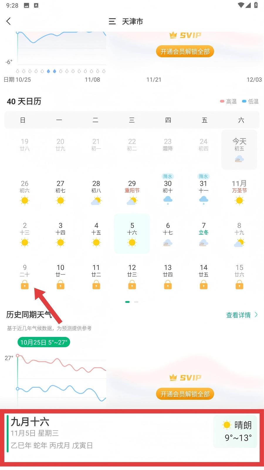 3、在【40天日历】中点击具体日期,不仅能查看当天天气,还能了解历史同期天气,连农历信息也能一并掌握哦。