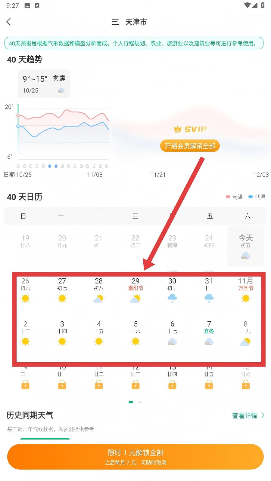 4、如果还想查看更往后的天气,开通专门的会员就可以解锁啦。
