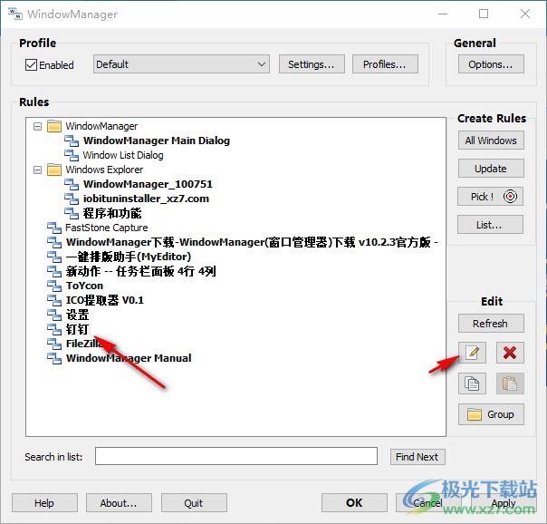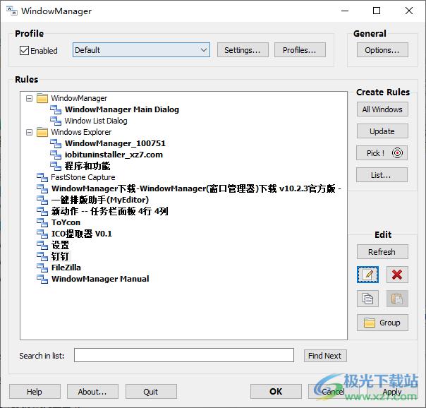 此列表显示当前由 WindowManager 在所选配置文件中处理的所有组和规则。当前打开的窗口的规则将用粗体字绘制。双击某个项目将打开该规则或组的属性对话框。您只需将列表中的项目拖放到任何新位置即可对其重新排序。规则从上到下检查,第一个匹配窗口的规则将被执行,因此它们在列表中的顺序很重要。