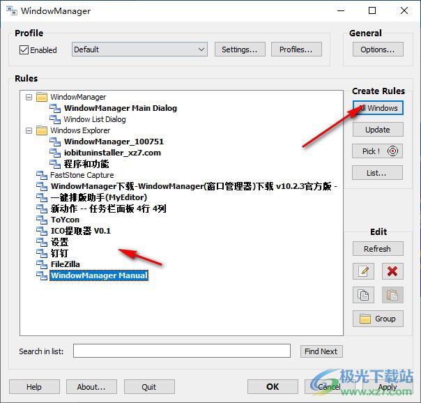 所有窗口:单击此按钮可为当前打开的所有窗口创建规则。如果窗口的规则已经存在,它将被更新(例如,窗口的当前位置和大小将在规则中更新)。如果没有规则与窗口匹配,WindowManager 将尝试根据配置文件的模板创建新规则。如果找到匹配的模板,则会基于该模板创建规则并将其添加到列表中。默认情况下,规则的名称将是窗口标题。