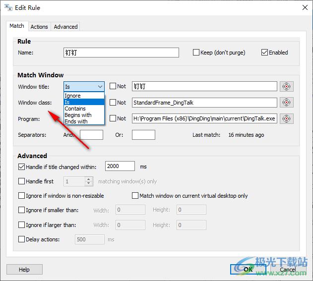 窗口类:此字段定义窗口类(操作系统内部类型标识符)的文本。 WindowManager 会将此文本与新打开的窗口的窗口类进行比较,以检查此新窗口是否应按此规则处理。您可以选择忽略窗口类(在这种情况下任何类都将匹配),完全匹配,检查文本是否包含在窗口类中,以及它是否以给定文本开头或结尾。此外,您可以选择“不”来匹配相反的内容(例如“不包含”、“不以开头”等)。这些选项使窗口类匹配非常灵活。您可以单击并按住十字准线按钮,然后移动鼠标光标以获取屏幕上任何窗口的窗口类。
