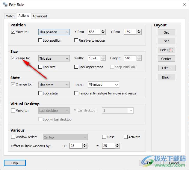 调整为:选中此选项可调整窗口大小。您可以在“此尺寸”和“最后尺寸”之间进行选择,以便窗口始终调整为在“宽度”和“高度”字段中输入的尺寸,无论它之前打开或调整了哪种尺寸,以便它将以最后一个大小打开(当它最后一次关闭或手动更新规则或通过更新触发器更新时)。在后一种情况下,“宽度”和“高度”值将显示窗口的最后大小。您可以将“宽度”或“高度”留空,以不更改窗口的相应位置,只更改非空的位置。新规则的默认模式(“this”或“last”)可以在配置文件设置中的规则模板中定义。