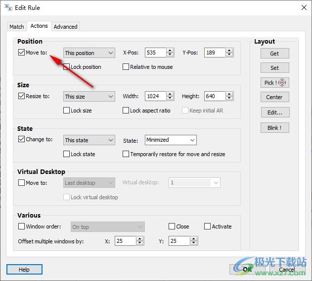 移动到:选中此选项以移动窗口。 您可以在“此位置”和“上一个位置”之间进行选择,以便窗口始终移动到在“X-Pos”和“Y-Pos”字段中输入的位置,无论它之前打开或移动到哪里 ,以便它将在最后一个位置打开(上次关闭的位置或手动更新规则或通过更新触发器更新规则的位置)。 在后一种情况下,“X-Pos”和“Y-Pos”值将显示窗口的最后位置。 您可以将“X-Pos”或“Y-Pos”留空,以不更改窗口的相应位置,只更改非空的位置。 该位置始终相对于整个桌面区域,跨越所有显示器,因此对于位于主显示器左侧或上方的显示器,坐标甚至可能为负! 新规则的默认模式(“this”或“last”)可以在配置文件设置中的规则模板中定义。