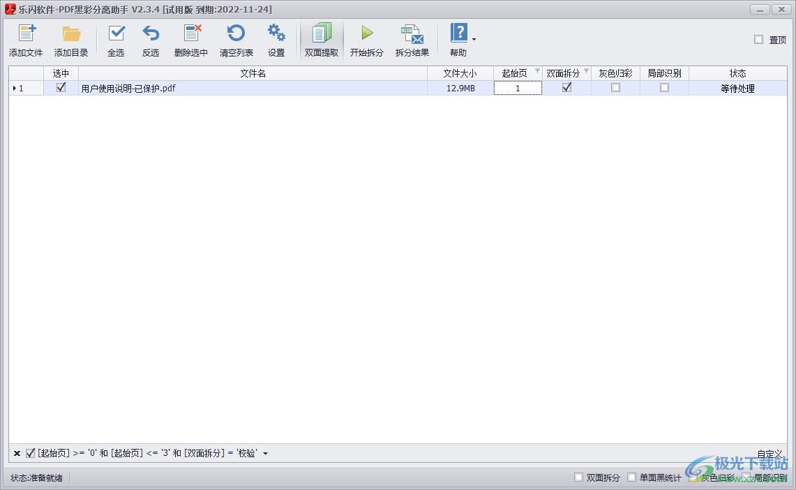 乐闪PDF黑彩分离助手是一款可以帮助用户轻松将PDF文档黑白页面和彩色页面分割的软件,添加文档到软件就可以直接选择开始拆分,轻松获取新的页面,方便用户从PDF文档中快速提取彩色的页面独立保存为PDF,您可以添加多个PDF文档到软件上拆分,一键提取彩色页面,一键提取黑白页面;有时候自己需要独立将彩色的PDF打印,但是部分PDF页面显示黑白内容,也显示彩色内容,导致无法独立打印,通过乐闪PDF黑彩分离助手就可以自动完成页面颜色识别,几秒钟就可以提取彩色的页面,这样就可以独立将全部彩色页面打印了!