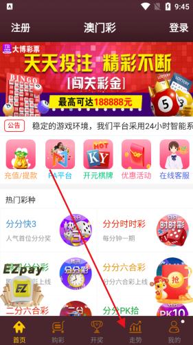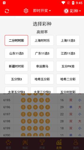 2、在走勢界麵點擊右上角的【彩種】選擇想要查看的彩票類型;