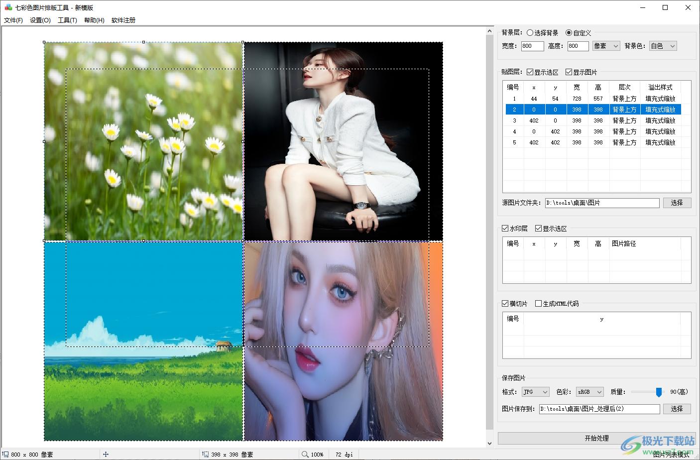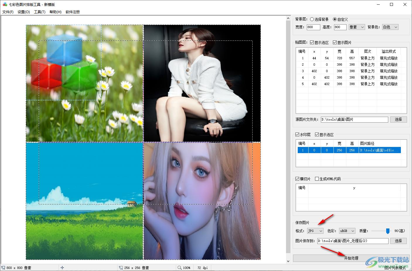 七彩色图片排版工具可以帮助用户快速对本地的图像添加排版样式,例如可以将多张图像排版到九宫格中使用,九宫格的数量是可以自己设置的,可以设置四宫格类型,可以设置八宫格类型,也可以添加心型图,将图像显示在心型模板中,以后就可以打印心型图像,软件界面还是非常简单的,设置功能在右侧显示,可以手动设置背景样式,设置贴图层内容,添加源图片文件夹,设置水印内容,最后点击开始处理就可以将源图片文件夹的内容显示在排版方案中。