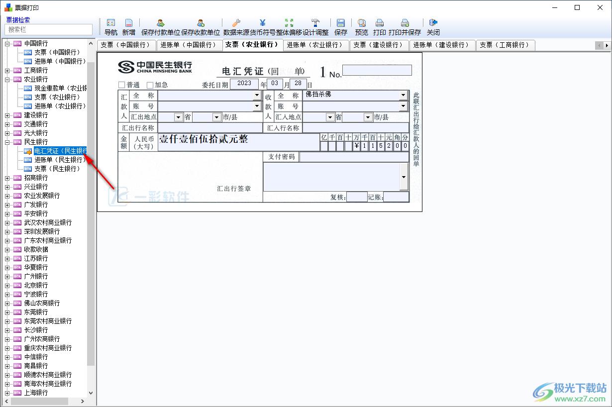 9、在软件左侧就可以找到银行,支持电汇凭证(民生银行)、进账单(民生银行)、支票(民生银行)