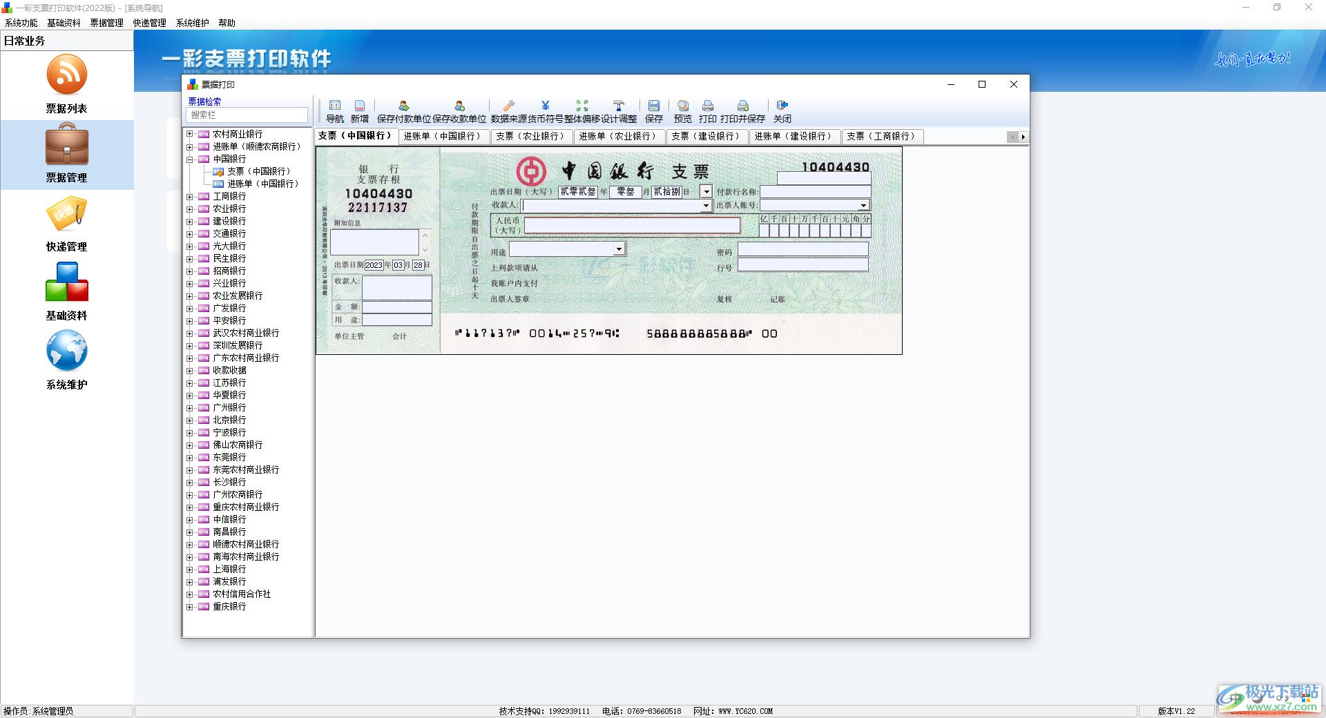 一彩支票打印软件提供多家银行的支票模板,直接在软件选择一个模板就可以填写支票的数据,从而打印使用,例如可以直接在软件选择中国银行的支票,在软件界面填写收款人、付款单位、出票人账号、用途就可以直接打印,以后就可以随意在支票上填写金额了,软件支持几十个银行支票打印使用,可以在票据管理界面直接开票,也可以对票据内容做简单的调整,也可以在模板上管理自己常用的银行支票,可以将支票设置为常用,设置为默认支票,同时一彩支票打印软件也可以对多家快递公司的单据打印,需要就可以下载使用!