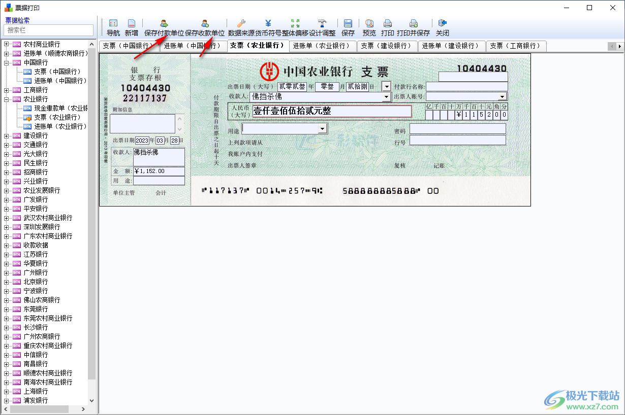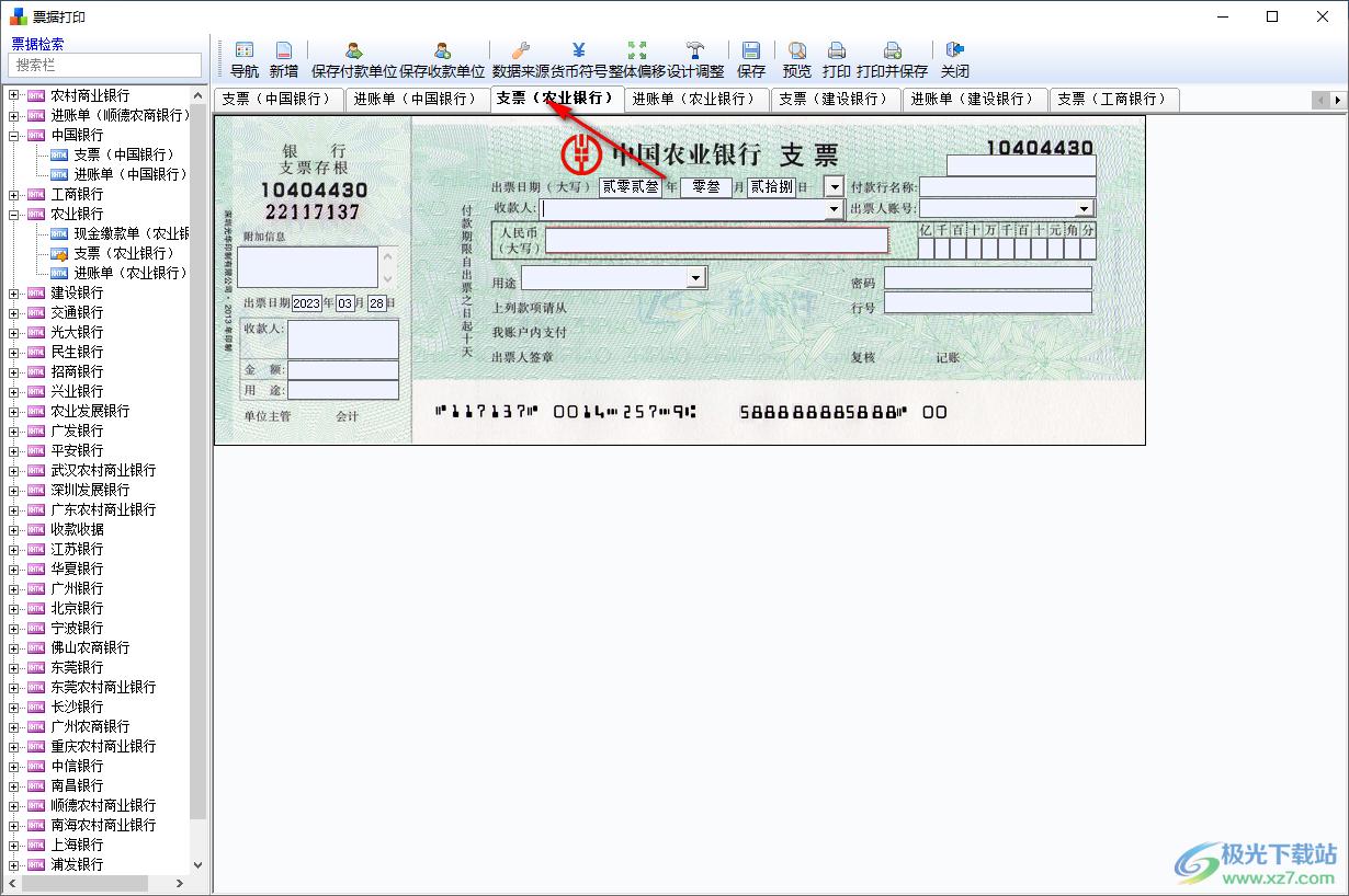 4、显示票据打印界面,直接在软件左侧选择一个银行,在软件界面填写支票信息